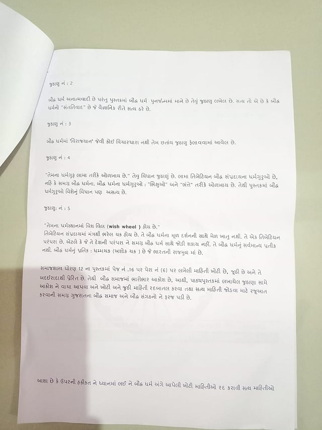 Last week, the office of the GSBST director received representations from the Gujarat Buddhist Academy (GBA), former GPSC member Mulchand Rana, and numerous followers of Buddhism, demanding the removal of the "lies" from the textbook and their replacement with accurate information.